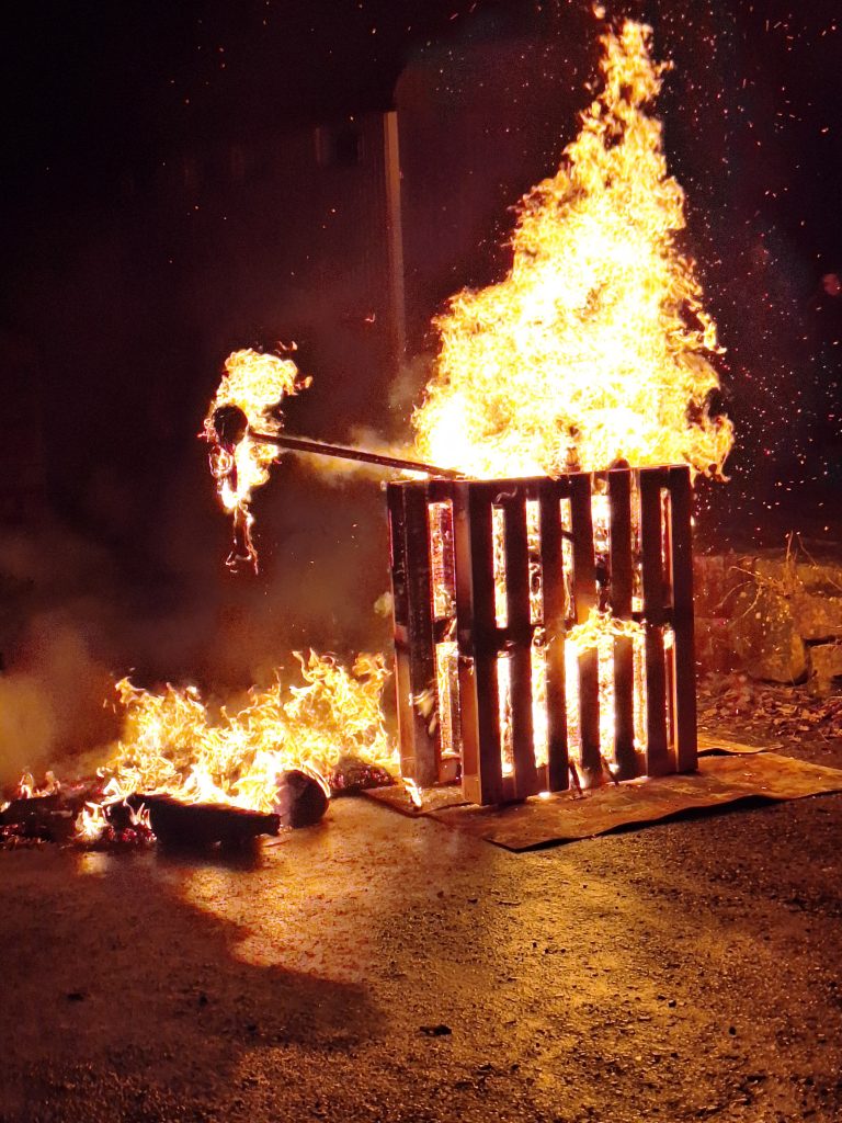 Einige Zuschauer hatten sich bereits vor der Narrhalla versammelt. Ein letztes Mal wurde zusammen geschunkelt und gesungen, bevor die Faschingspuppe feierlich lichterloh verbrannte – ein symbolischer Abschied vom närrischen Treiben der vergangenen Wochen.