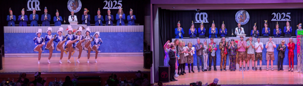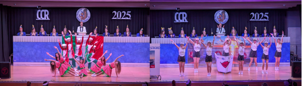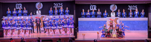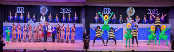 Nach der Pause durfte unser neuer Präsident zum ersten Mal die Gesellschaft hübscher Damen auf der Bühne genießen. Udo Käsmann tauschte während der Pause seinen Männerelferrat gegen den Damenelferrat. Ein letztes Mal standen das Tanzpaar Manuel Pfister und Eva Urgiebl gemeinsam auf der Bühne. Unter dem Motto „Feierabend“ präsentierten sie einen wahren Augenschmaus mit herausragender Performance und beeindruckenden Hebungen. Im Anschluss wurden Sie euphorisch vom Publikum verabschiedet. Musikalisch ging es im Programm weiter mit der CCR Hitparade. Man hat keine Kosten und Mühen gescheut und bekannte Künstler eingeladen wie Margot und Maria Hellwig, Wolfgang Petry, Die Jacob Sisters, David Hasselhoff, ABBA, Voxxclub, Toni Holiday und als krönender Abschluss Helene Fischer. Im Saal herrschte eine ausgelassene Stimmung und das Publikum ließ sich mitreißen. Mit ihrem Schautanz zum Motto „Bella Italia“ entführte die Jugendgarde das Publikum nach Italien. In rot-weiß-grünen Kostümen lieferten sie eine großartige Show mit City-Rollern als Vespa und typischen Pizzabäckern, begleitet von toller Musik. Die Gruppe Taktlos (Ulrike Lorenz, Peter Straub und Manuel Pfister) stand dieses Jahr als Sternsinger verkleidet auf der Bühne und besang unter anderem das geschlossene Gasthaus „Stern“. Mit Witz und Charme wurden einige Lieder der Sternsinger umgedichtet und auf humorvolle Weise präsentiert. Als Matrosen verkleidet präsentierte die Nachwuchsgarde einen tollen Schautanz unter dem Motto „Auf zu neuen Ufern“ – mit bekannten Hits wie „Alles im Griff auf dem sinkenden Schiff“, „Knallrotes Gummiboot“ und einem Hauch Titanic. Turbulent wurde es im Anschluss beim Sketch von Christine Lebküchner und Sabine Fries: Sie verwandelten die Bühne in ein Massagestudio, in dem die beiden Patienten Ferdinand Pfister und Udo Häufglöckner ordentlich durchgeknetet und gestreckt wurden – denn die Masseurinnen ließen ihren Frust über ihre Eheprobleme gnadenlos an ihnen aus. Am Samstagabend hatte das Publikum regelrechte Lachkrämpfe, als Christine vollen Körpereinsatz zeigte und Ferdi samt Massageliege kurz vor Schluss zu Boden ging. Ihren Abschlusstanz präsentierte die Prinzengarde unter dem Motto „Wikinger“ – mit tollen Kostümen und einer beeindruckenden Choreografie. Im Schautanz wurde Manuel Pfister als Trainer von Chiara Link und Loana Kalasch unterstützt. Einen charmanten Rückblick auf die letzten 15 Jahre der Prinzengarde boten Gardemädels aus anderen Gruppen, die in die ehemaligen Kostüme von der Minigarde bis zur Prinzengarde schlüpften. Am Samstagabend gab es als kleine Überraschung eine Torte und ein Präsent vom CCR sowie ein paar herzliche Abschiedsworte vom Präsidenten. Die letzte Büttenrede des Abends hielt Andreas Schuld. Mit viel Witz nahm er das Publikum mit auf eine chaotische Italienreise – eine Urlaubsfahrt voller Missgeschicke und skurriler Erlebnisse. Den krönenden Abschluss des Abends gestaltete das Männerballett mit seinem humorvollen Tanz „Bienchen und Blümchen“ – eine originelle Showeinlage mit viel Witz und tänzerischem Einsatz, die das Publikum begeisterte. Zum großen Finale des Abends versammelten sich alle Aktiven noch einmal auf der Bühne, um mit einer Polonaise zu starten. Präsident Udo Käsmann feierte eine gelungene Premiere. Lieber Udo, wir hoffen, dass wir dich auch weiterhin unseren Präsidenten nennen dürfen.